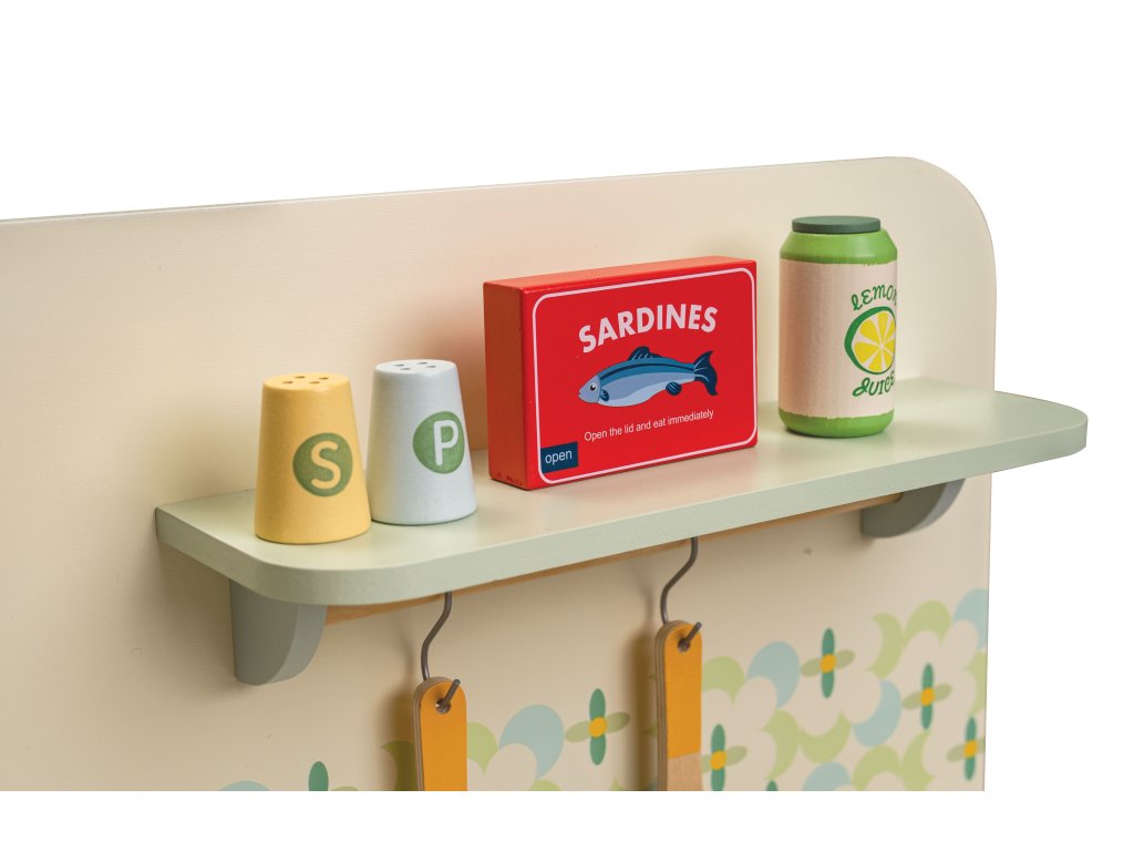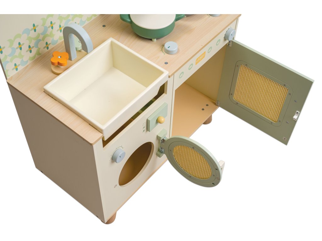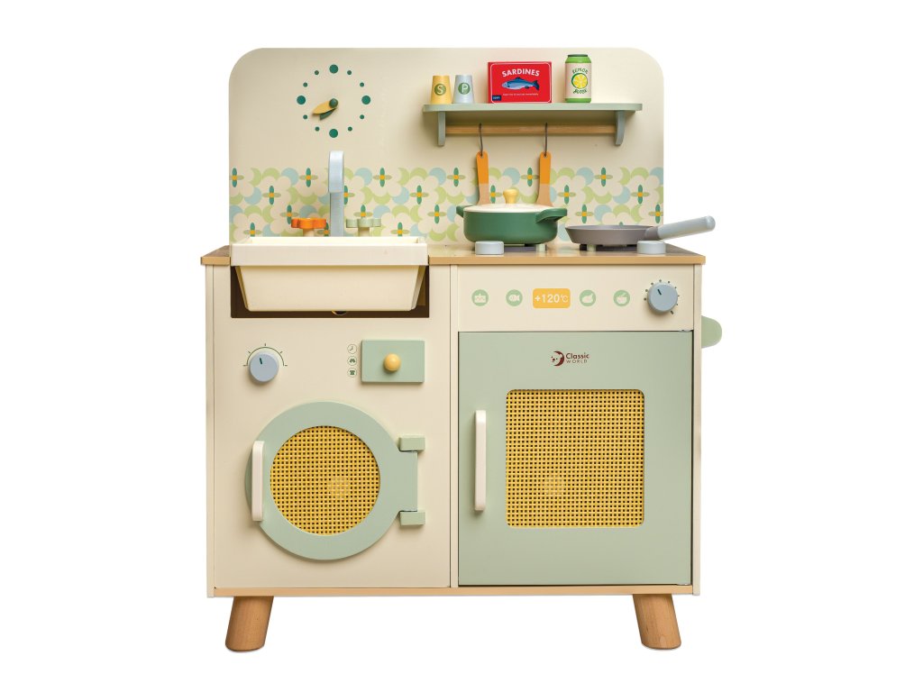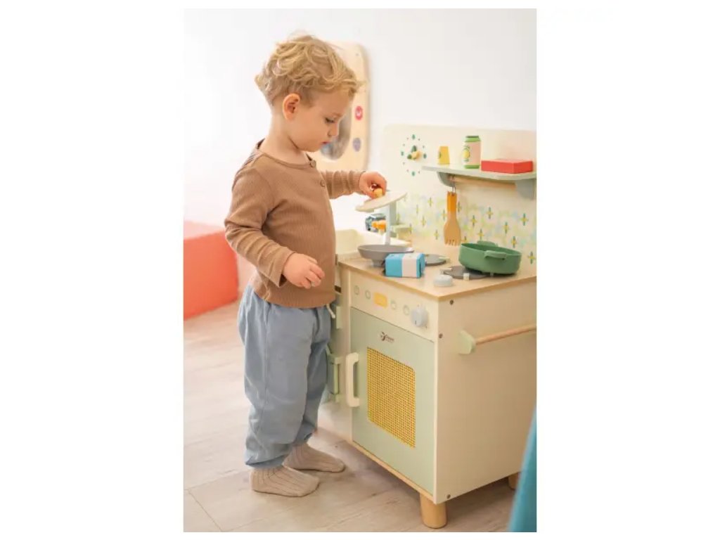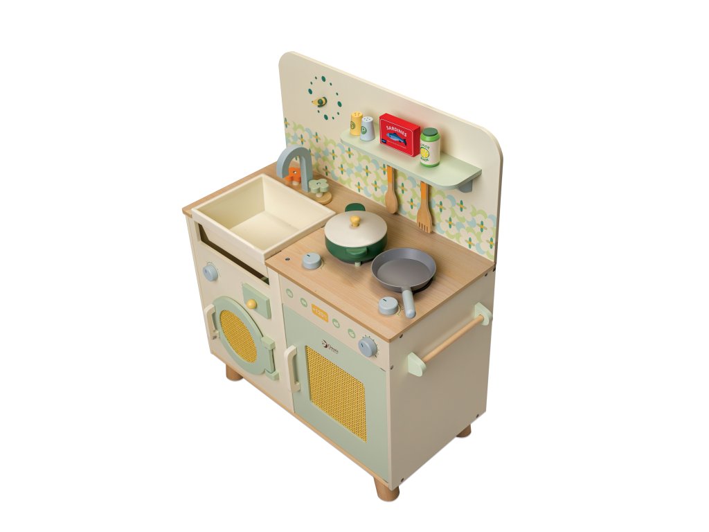 Dřevěná kuchyňka (74 × 30 × 60 cm) se sporákem, troubou, dřezem a baterií. Součástí jsou realistické doplňky (krabice od mléka, konzervy). Rozvíjí představivost, kreativitu a sociální dovednosti.