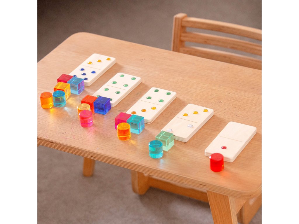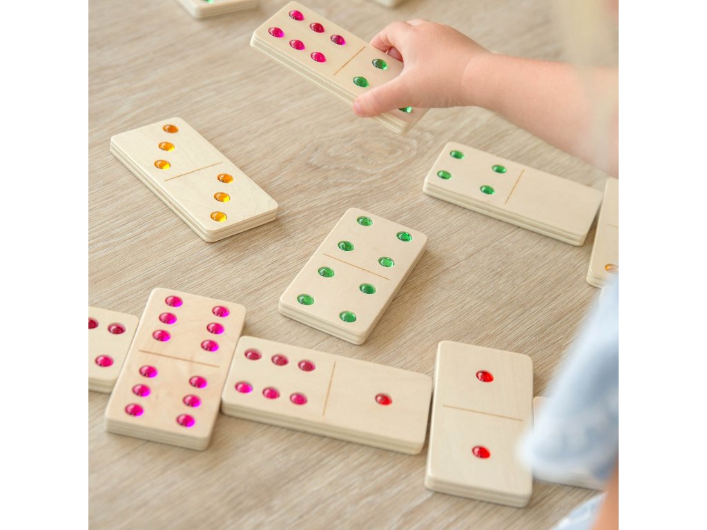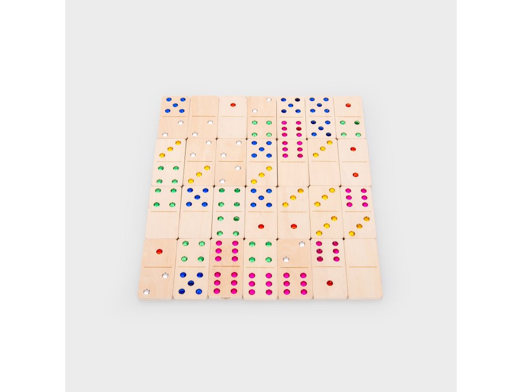 Sada 28 velkých dřevěných dominových kostek (110 × 55 mm) s certifikací FSC. Místo puntíků mají kostky třpytivé barevné kamínky, které usnadňují přiřazování a stimulují hmat. Vhodné pro klasickou hru, počítání, jednoduchou matematiku i hmatové aktivity (vtlačování do modelíny).