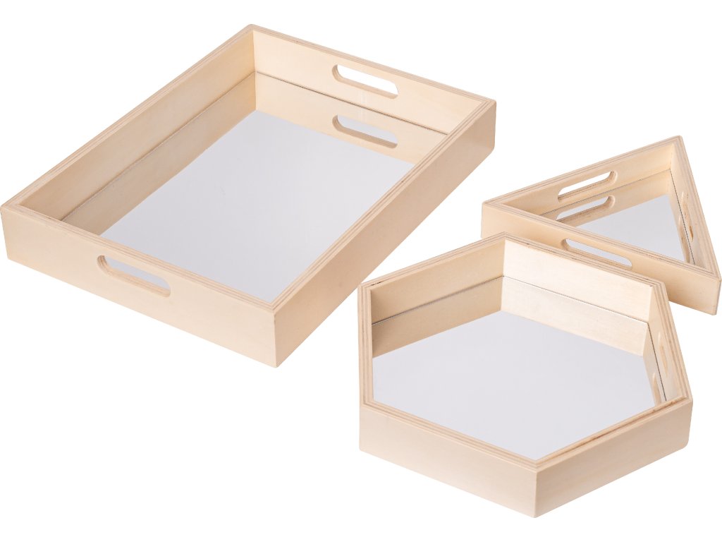 Sada 3 dřevěných táců se zrcadlovým dnem (obdélník 40×30 cm, šestiúhelník 27×30 cm, trojúhelník 23,5×21 cm). Vhodné pro logopedii, terapii, třídění a hry s předměty. Rozvíjí koordinaci a vnímání.