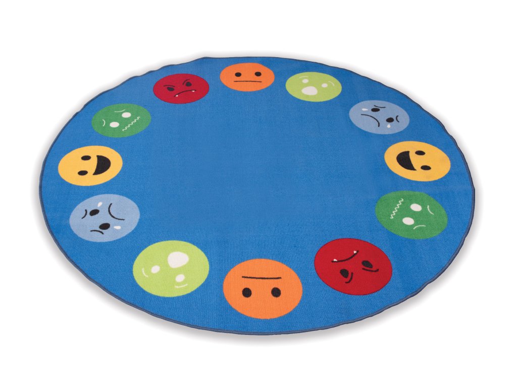 Kulatý koberec s motivem emocí (průměr 2 m) ze smyčkového polyamidu Bouclé. Měkký, trvanlivý, s protiskluzovou zadní stranou. Vhodný pro skupinové aktivity, hry a rozvoj emocionální inteligence v MŠ, školách a terapiích.