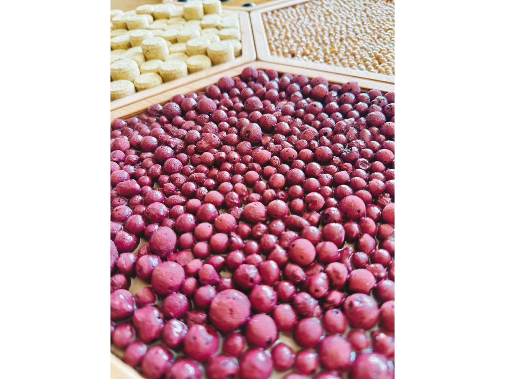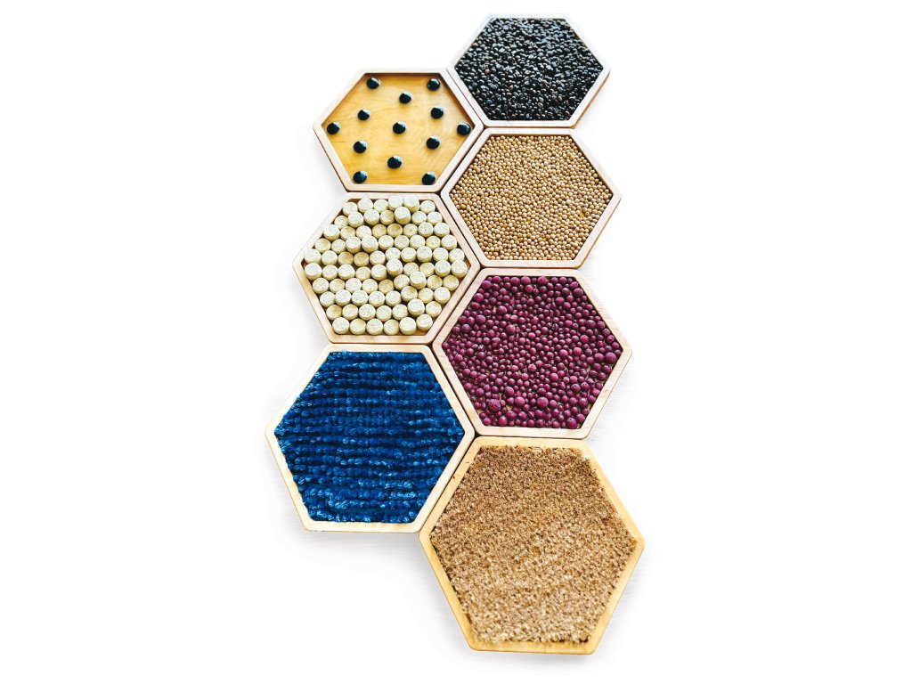 Sada 7 dřevěných hexagonálních senzorických panelů (úhlopříčka 27 cm) s různými texturami (káva, korek, keramzit, cizrna, kokos, mop, skleněné pastilky). Stimuluje hmat, rovnováhu a koordinaci.