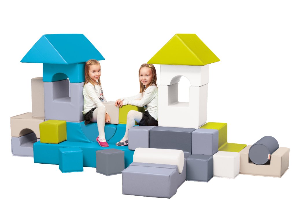 Sada 30 pěnových kostek různých velikostí (od 20 × 20 × 20 cm do 120 × 40 × 40 cm). Podporuje kreativní stavění, rozvoj motoriky, prostorového vnímání a týmovou spolupráci. Odolný a snadno čistitelný povrch.