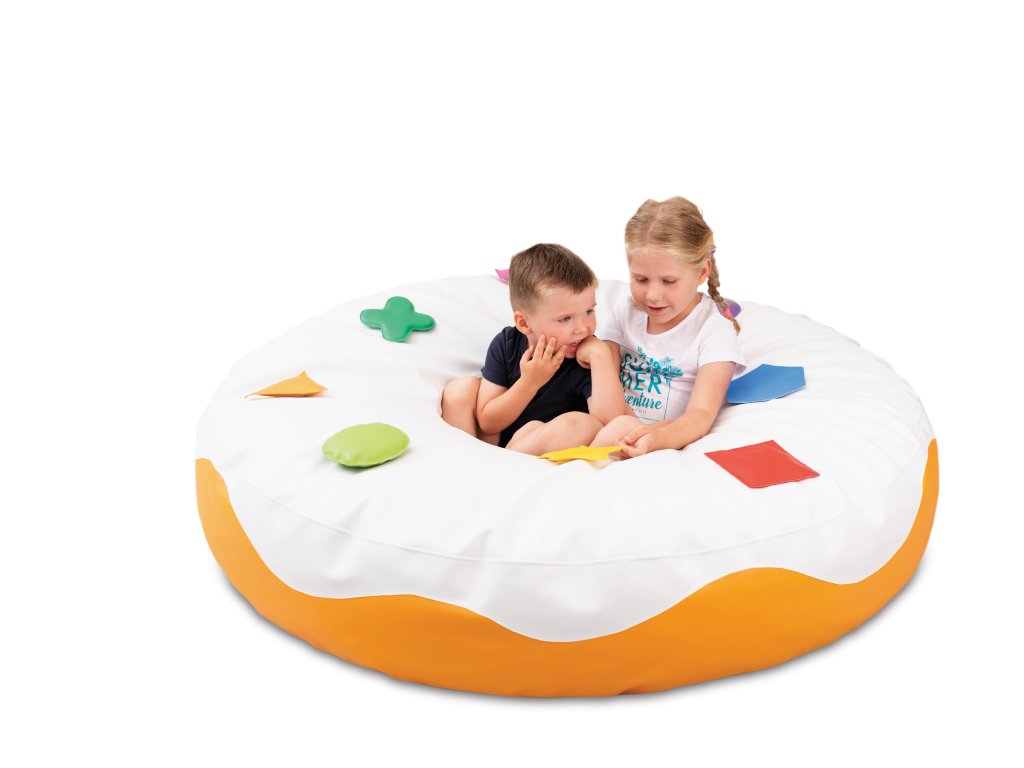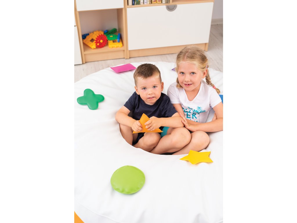 Senzorické sedátko Kobliha (průměr 120 cm) z odolného PVC s pěnovou výplní. 8 odnímatelných barevných aplikací na suchý zip (posypka) pro rozvoj jemné motoriky. Vhodné pro relaxaci, odpočinek a hru.