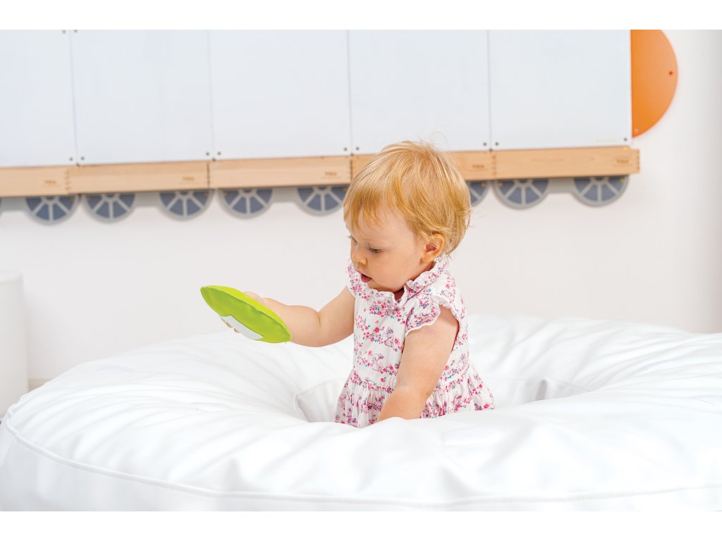 Kobliha je vybavena barevnými aplikacemi připomínajícími posypku na polevě, které stimulují jemnou motoriku a podněcují děti k manipulaci a interakci. Aplikace připevněné na suchý zip lze libovolně přichytávat a odlepovat, což děti zapojuje do rozvíjení dovedností uchopování, přiřazování a přemisťování prvků. Takové hry podporují učení barev a tvarů, díky čemuž je sedátko ideální volbou pro děti všech věkových kategorií.