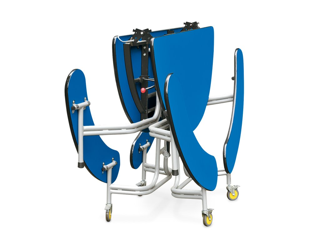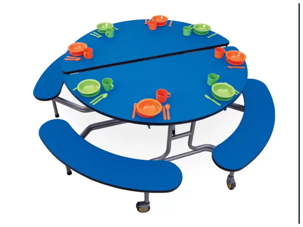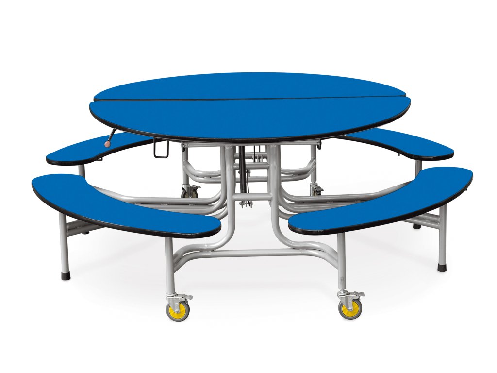Kulatý pojízdný stůl (průměr 150 cm) s lavicemi pro 8 osob (výška sedu 43,5 cm). Deska z laminované překližky, konstrukce z oceli a plastu. Vhodný do jídelen, školek a společenských místností.