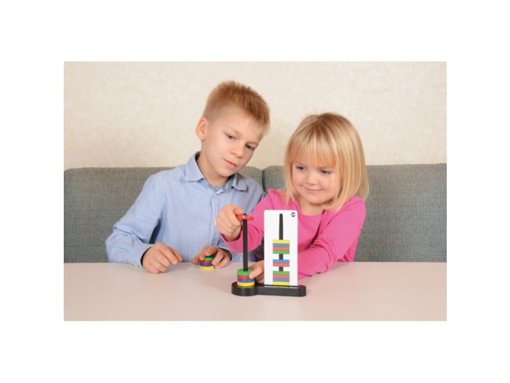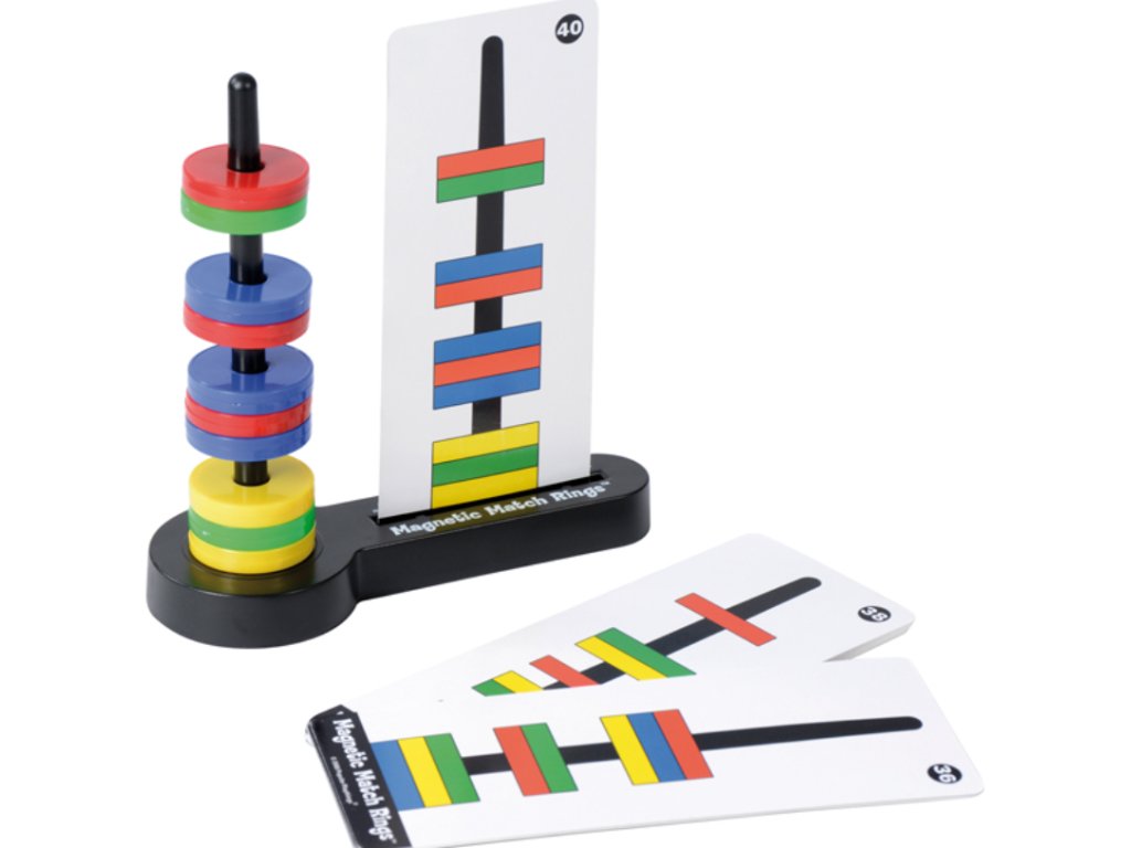 Sada magnetických kroužků (10 ks, průměr 3,5 cm) se stojanem (15 × 6 × 16 cm) a 40 předlohovými kartami. Děti navlékají kroužky podle vzoru a objevují princip přitahování a odpuzování magnetů. Rozvíjí jemnou motoriku, logické myšlení a zrakové vnímání.