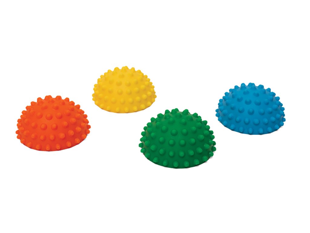 Sada 4 malých senzorických polokoulí (průměr 9 cm) v barvách zelená, žlutá, modrá, oranžová. S výstupky pro stimulaci chodidel, balanční cvičení a terapii.
