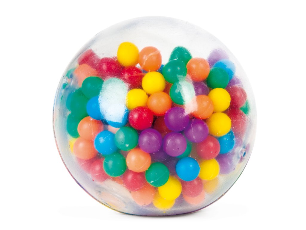 Průhledný gumový míček s barevnými korálky uvnitř (průměr 7 cm). Chrastí, vhodný pro nácvik házení, chytání a sluchovou stimulaci.