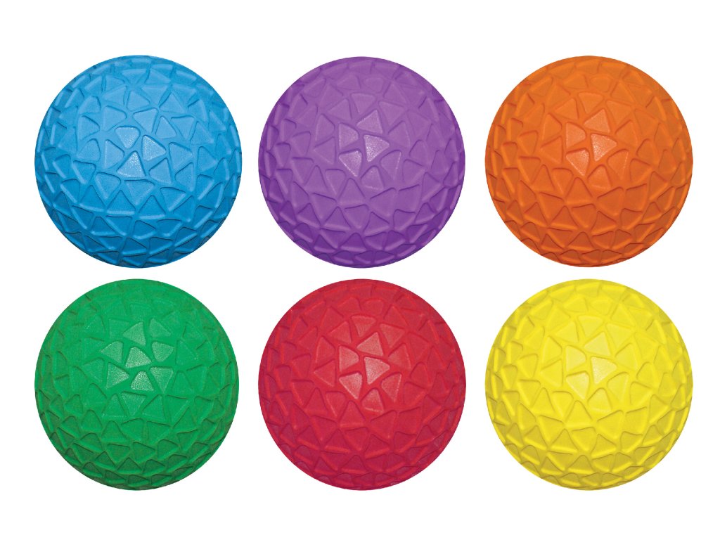 Sada 6 gumových vinylových míčků s trojúhelníkovými výstupky, které zajišťují snadný úchop i pro děti s dysfunkcemi. Míčky jsou určeny k samostatnému nafukování, což umožňuje přizpůsobit stupeň tvrdosti.