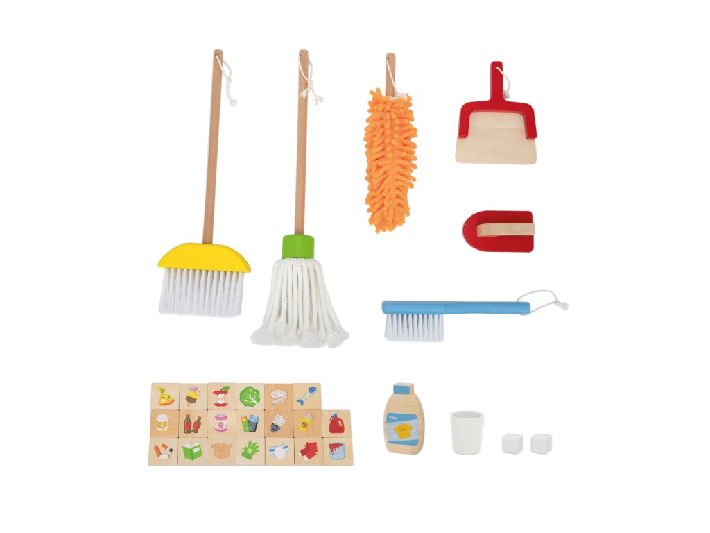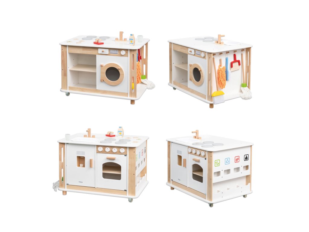 Pojízdný dřevěný kuchyňský koutek (80 × 56 × 60 cm) s troubou, dřezem, plotýnkami a minikontejnery na tříděný odpad. Součástí je sada úklidových potřeb a potravinových destiček. Podporuje hru na role, rozvoj sociálních a organizačních dovedností