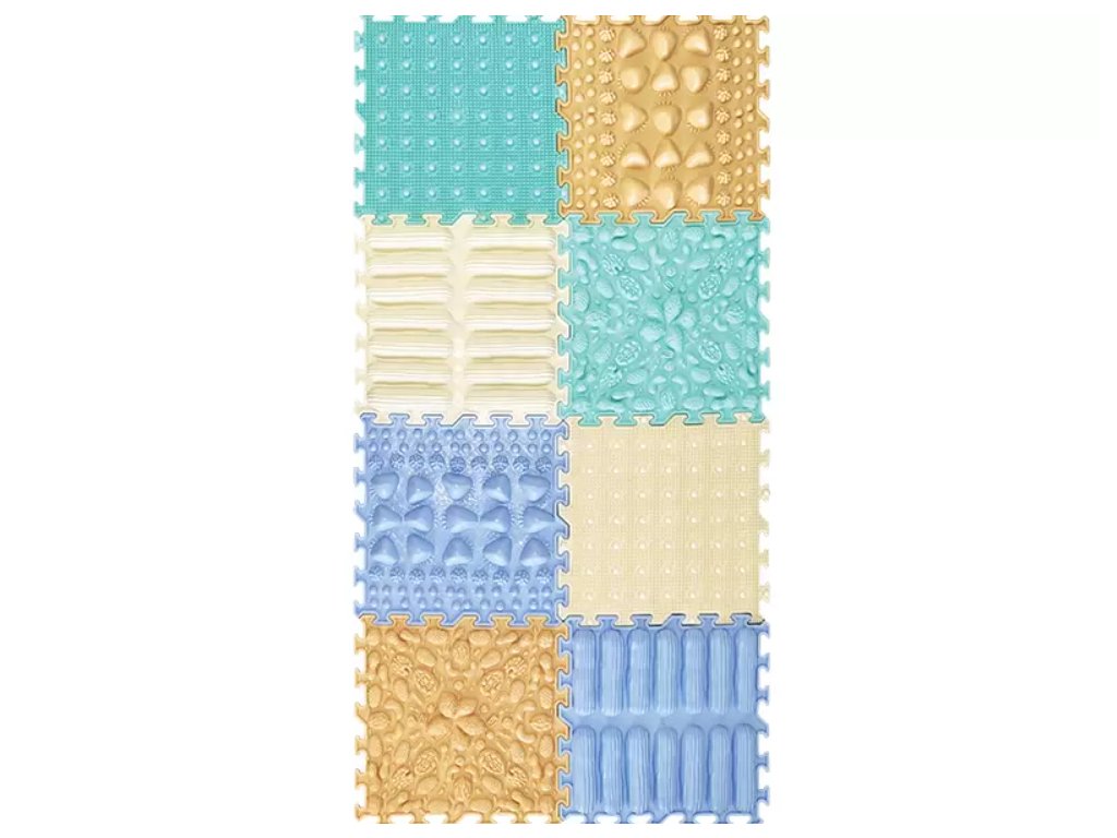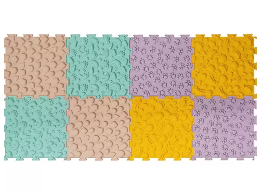 Sada 8 senzorických panelů (25 × 25 cm) v pastelových barvách s různými texturami. Stimuluje hmat, podporuje korekci nohou, rovnováhu a koordinaci. Bezpečné PVC bez ftalátů.