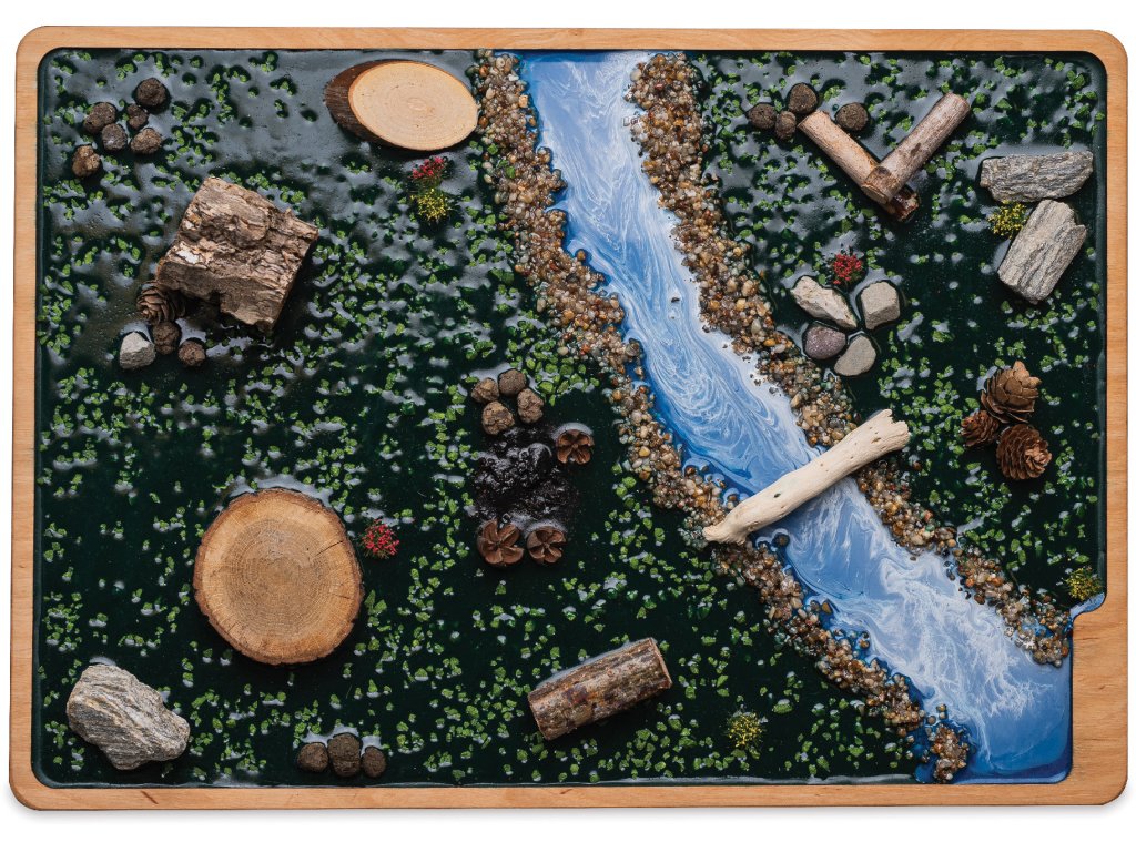 Ručně vyrobený senzorický panel Les (35 × 50 cm) s různými texturami inspirovanými lesním prostředím (mech, kůra, kameny). Stimuluje hmat, rozvíjí jemnou motoriku a koordinaci rukou.