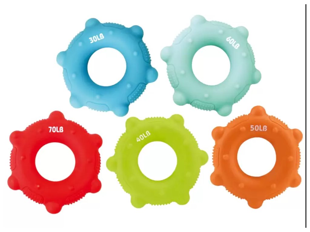 Sada 5 terapeutické posilovače v různých barvách a úrovních odporu (9–27 kg). Ergonomický tvar a protiskluzový povrch. Vhodné pro posilování rukou, rozvoj jemné motoriky a uvolnění stresu.